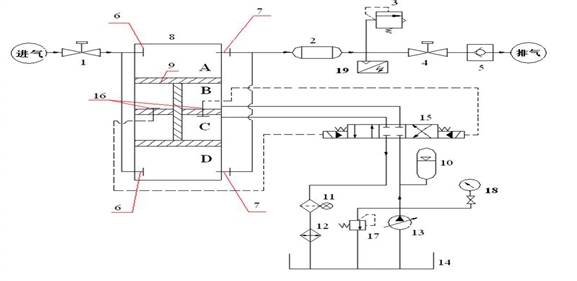 液壓站輸出的高壓油進(jìn)入 C 腔, B 腔的油回油箱(近似認(rèn)為回油箱的油壓力為0),活塞桿向下運(yùn)動(dòng),槽車內(nèi)氣體進(jìn)入 A 腔(一級進(jìn)氣),而 D 腔的氣體則經(jīng)壓縮后流出(一級壓縮),進(jìn)入冷卻器,完成一級壓縮過程;當(dāng)活塞運(yùn)行到極點(diǎn)時(shí),液壓站換向閥將會換向,輸出的高壓油進(jìn)入 B 腔, C 腔的油回油箱,活塞桿向上運(yùn)動(dòng),槽車內(nèi)氣體進(jìn)入 D 腔(一級進(jìn)氣),而 A 腔的氣體則經(jīng)壓縮后流出(一級壓縮),進(jìn)入冷卻器,完成一級壓縮過程。