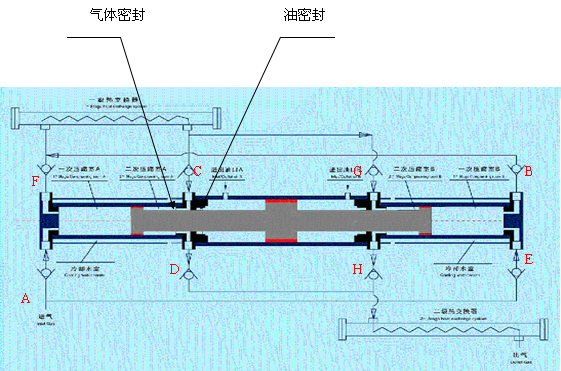 1. 活塞桿向右運(yùn)動(dòng)時(shí),槽車內(nèi)氣體由 A 進(jìn)入左邊氣缸的一級腔(一級進(jìn)氣),而右邊一級腔的氣體則壓縮后經(jīng) B 流出,進(jìn)入冷卻器,完成一級壓縮過程;同時(shí),冷卻后的氣體由 G 進(jìn)入二級腔(二級進(jìn)氣),左邊氣缸二級腔內(nèi)的氣體則壓縮后經(jīng) D 流入二級冷卻器,然后排出。