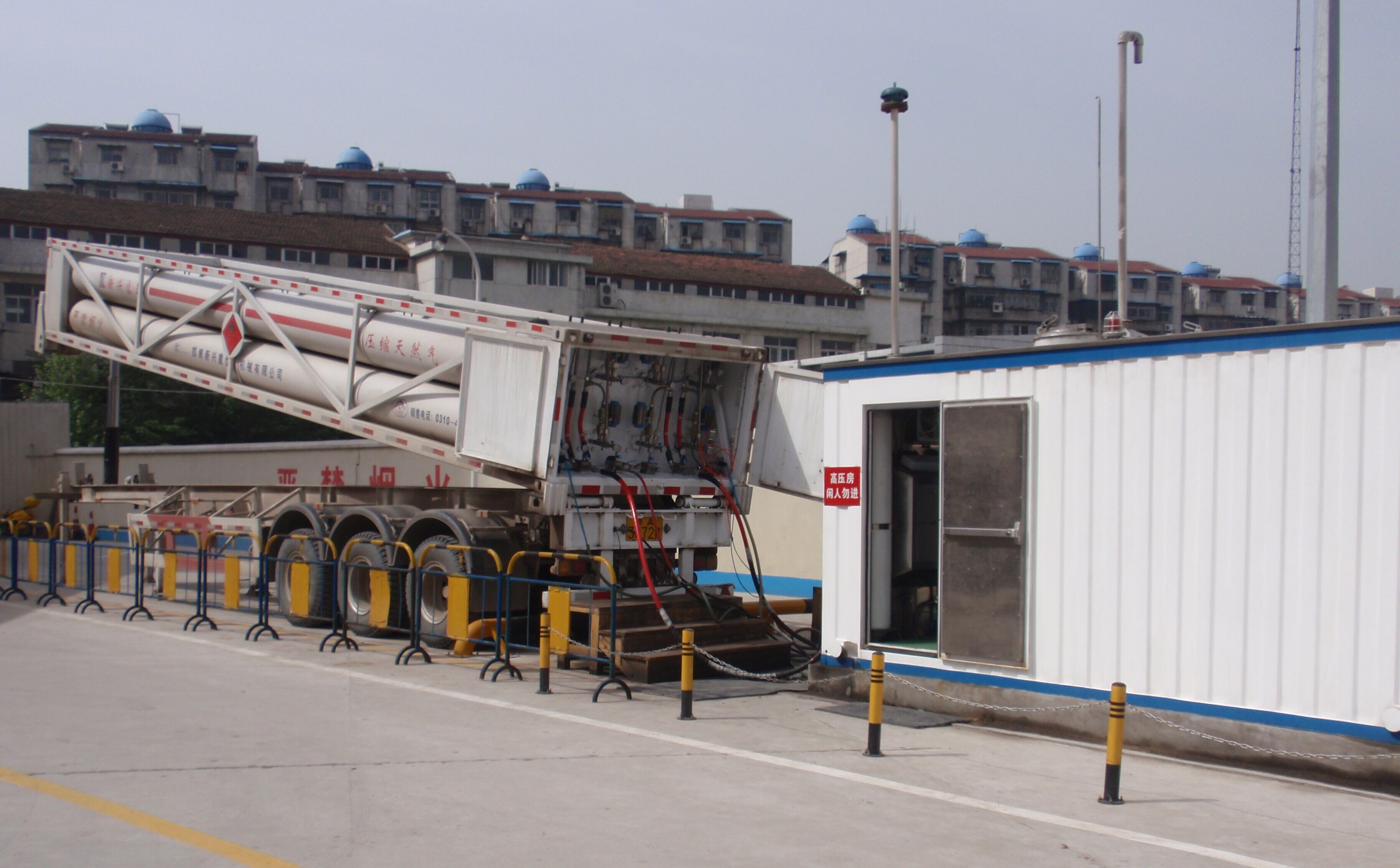 其工作原理是:液壓工作橇提供高壓油,通過(guò)一系列控制閥逐次注入專用槽車的每只長(zhǎng)管鋼瓶?jī)?nèi),將長(zhǎng)管鋼瓶?jī)?nèi)的天然氣以20MPA的恒定壓力推出來(lái),從而通過(guò)售氣機(jī)給汽車加氣。如下圖:左邊是專用槽車,右邊是液壓工作撬。