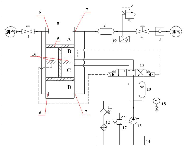 ①液壓站輸出的高壓油進(jìn)入 C 腔, B 腔的油回油箱(近似認(rèn)為回油箱的油壓力為0),活塞桿向下運(yùn)動(dòng),槽車內(nèi)氣體進(jìn)入 A 腔,(一級(jí)進(jìn)氣),而 D 腔的氣體則經(jīng)壓縮后流出(一級(jí)壓縮),進(jìn)入冷卻器,完成一級(jí)壓縮過(guò)程;當(dāng)活塞運(yùn)行到極點(diǎn)時(shí),液壓站換向閥將會(huì)換向,輸出的高壓油進(jìn)入 B 腔, C 腔的油回油箱,活塞桿向上運(yùn)動(dòng),槽車內(nèi)氣體進(jìn)入 D 腔,(一級(jí)進(jìn)氣),而 A 腔的氣體則經(jīng)壓縮后流出(一級(jí)壓縮),進(jìn)入冷卻器,完成一級(jí)壓縮過(guò)程