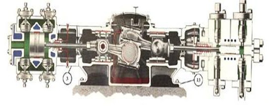 結(jié)構(gòu)原理:中間一個(gè)油缸帶動(dòng)兩邊的兩個(gè)氣缸,每個(gè)氣缸分為兩級(jí)壓縮。如下圖。