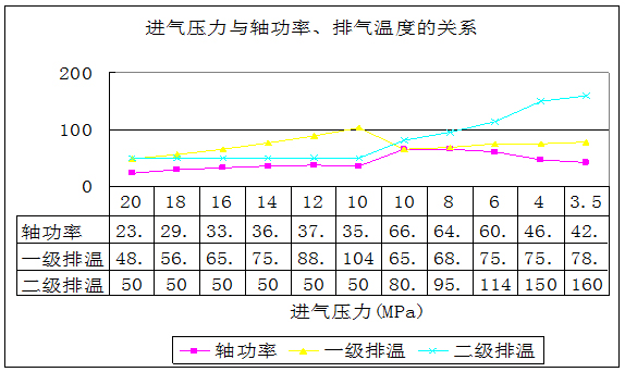 (4)能耗較大。選用電機(jī)功率較大(75kW或90kW),啟動(dòng)電流也大。因此不能頻繁啟動(dòng)。下圖是槽車壓力與軸功率和排氣溫度曲線。從圖線可以看出,槽車壓力在10MPa時(shí),功率最大,其它壓力段的無功損耗較多,并且,為了保證電機(jī)在空負(fù)荷下啟動(dòng),在停機(jī)時(shí)要將氣缸及管線內(nèi)的氣體放空。